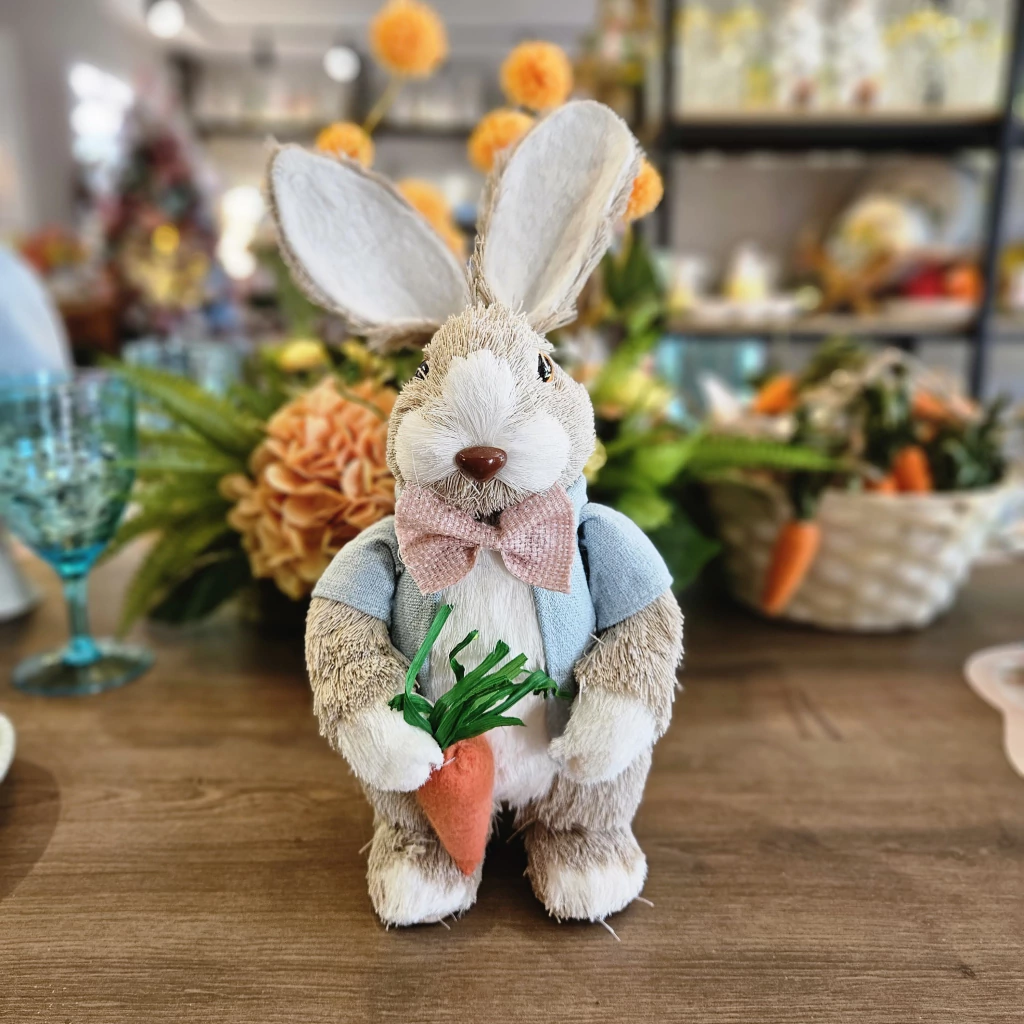 PÁSCOA COELHO MACHO EM PÉ CAMISA AZUL COM CENOURA: