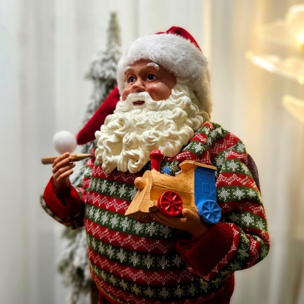 NATAL PAPAI NOEL EM PÉ COM PIJAMA SEGURANDO TREM: