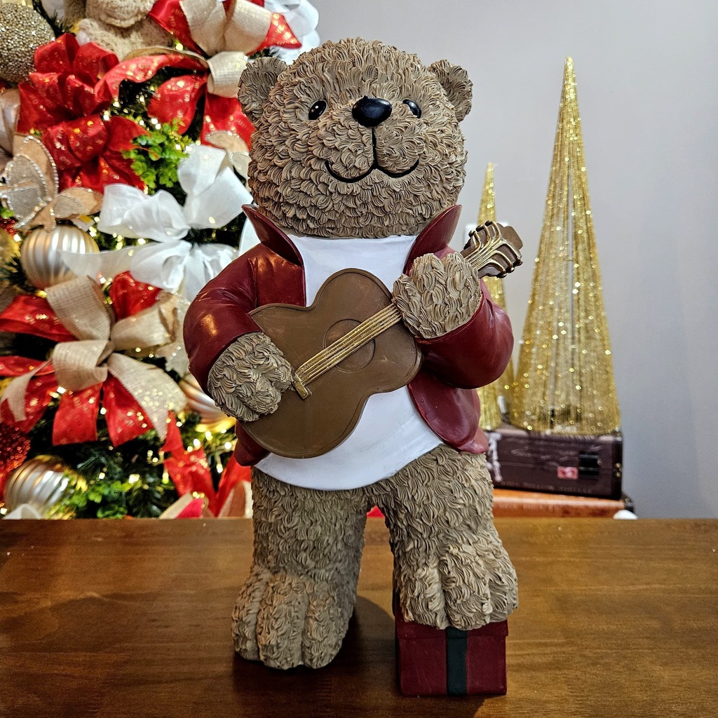 NATAL URSO EM RESINA MUSICO VERMELHO E BRANCO 42CM VIOLÃO: